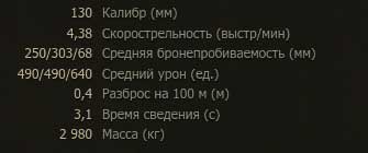 Как было отмечено ранее, орудие танка ИС-7 в МТ не отличается хорошей точностью, показатели бронепробиваемости также оставляют желать лучшего. Для хорошо бронированных целей лучше подготовить кумулятивные снаряды. Средний разовый урон пушки С-70 составляет 490 единиц. Характеристики орудия 130мм С-70 показаны на рисунке.